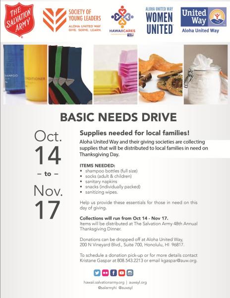 Help us collect basic needs for those attending The Salvation Army Annual Thanksgiving Dinner. Your donation can be dropped off at Aloha United Way from now until November 17.