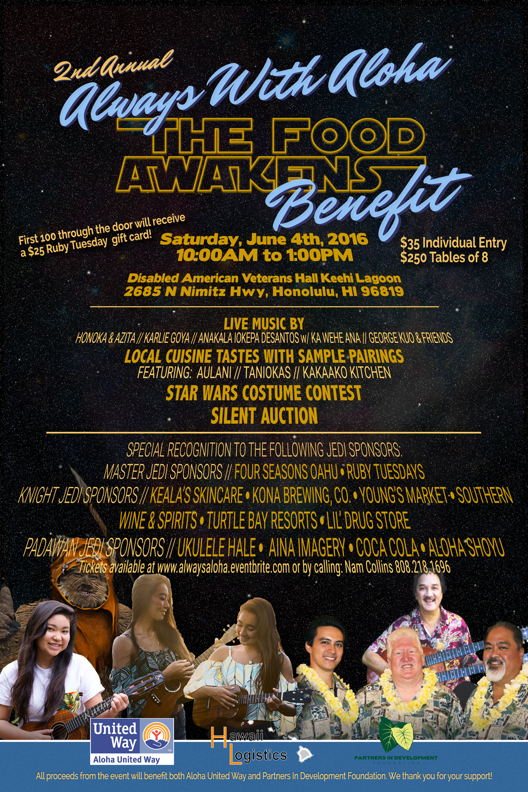 Join the celebration! Come out to the 2nd Annual Always With Aloha Benefit event in partnership with Partners in Development and Aloha United Way. This year's theme is The Food Awakens an intergalactic take on local cuisine!