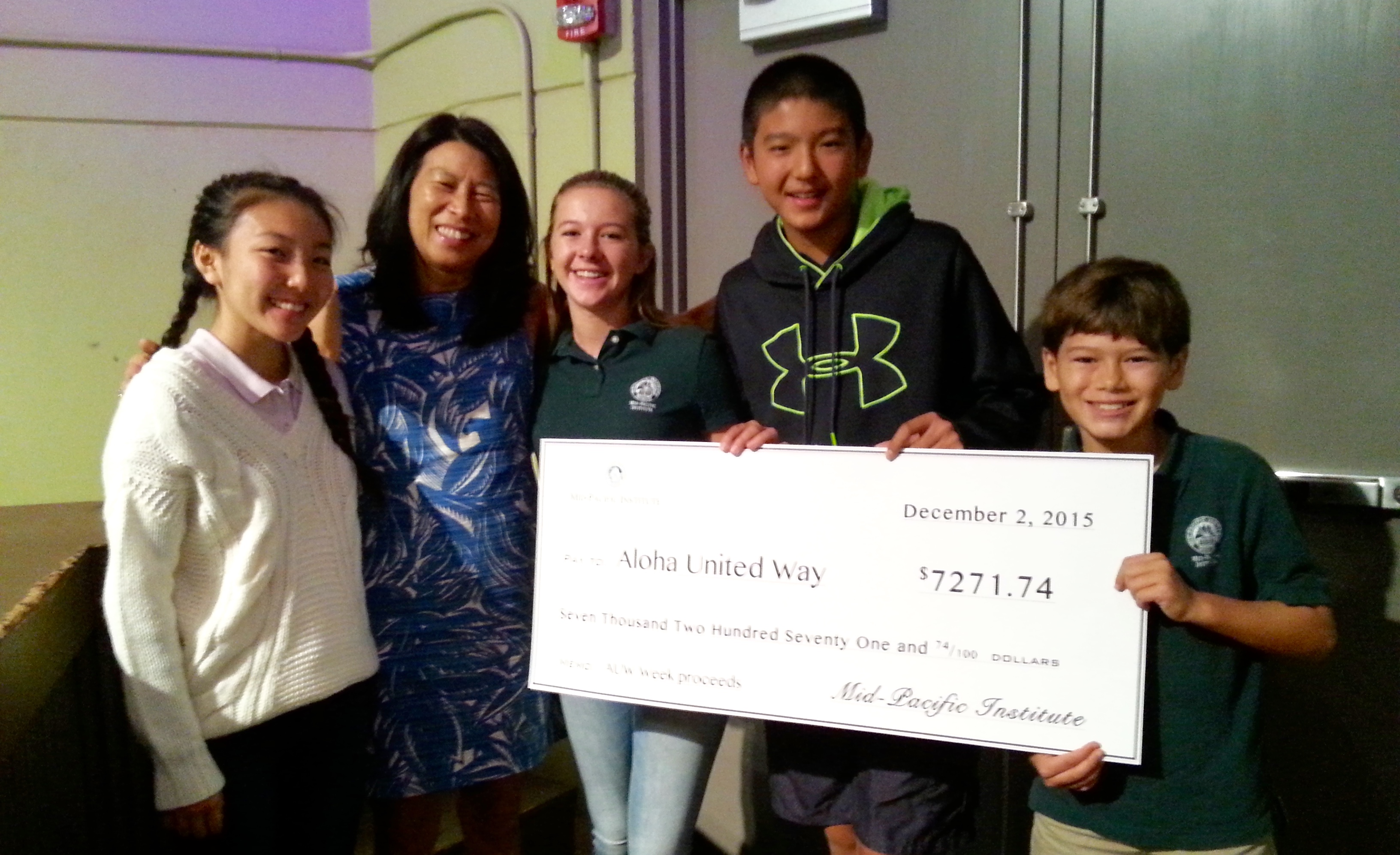 Dec. 2, 2015A BIG thanks goes out to Mid-Pacific Institute for raising over $7,000 for Aloha United Way and our community. Featured in the photo are 4 students from their student council each representing grades 6th - 8th.